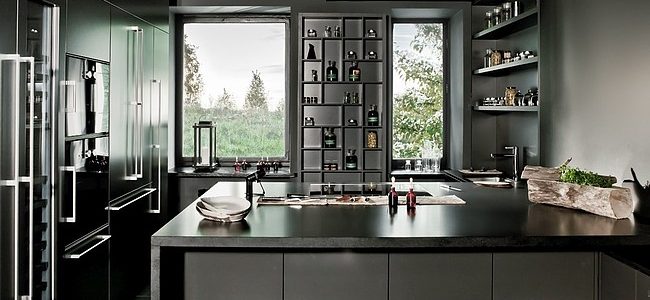 Taka kuchnia, jeśli jest otwarta na salon, idealnie wpisuje się w aranżację całego wnętrza. Jej formę można jeszcze bardziej wydobyć i podkreślić, przy zastosowaniu ledowego oświetlenia, jak również doskonale komponujących się z ciemnymi kolorami zielonych roślin. Także dodatki z surowego drewna czy ceramiki będą odpowiednio kontrastowały z czernią i stanowiły ciekawy motyw.